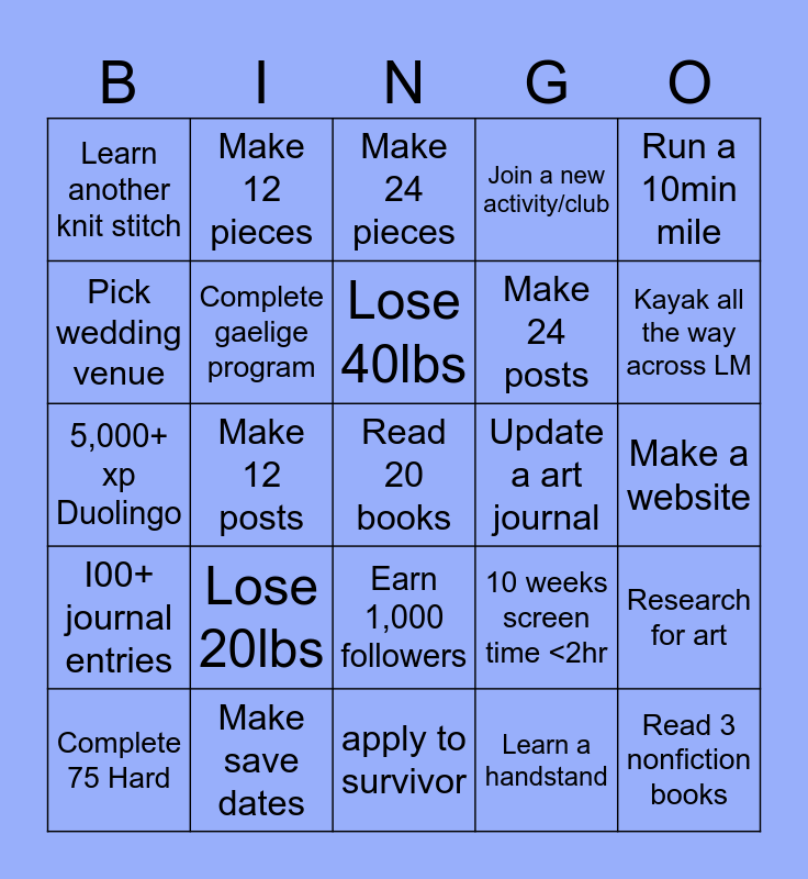 This bingo card has a free space and 24 words: Complete 75 Hard, Lose 20lbs, Lose 40lbs, Learn a handstand, Run a 10min mile, Learn another knit stitch, Make 12 pieces, Make 24 pieces, Update a art journal, Make a website, 5,000+ xp Duolingo, Complete gaelige program, 10 weeks screen time <2hr, Research for art, Pick wedding venue, Make save dates, apply to survivor, Join a new activity/club, Kayak all the way across LM, I00+ journal entries, Make 12 posts, Earn 1,000 followers, Make 24 posts and Read 3 nonfiction books.