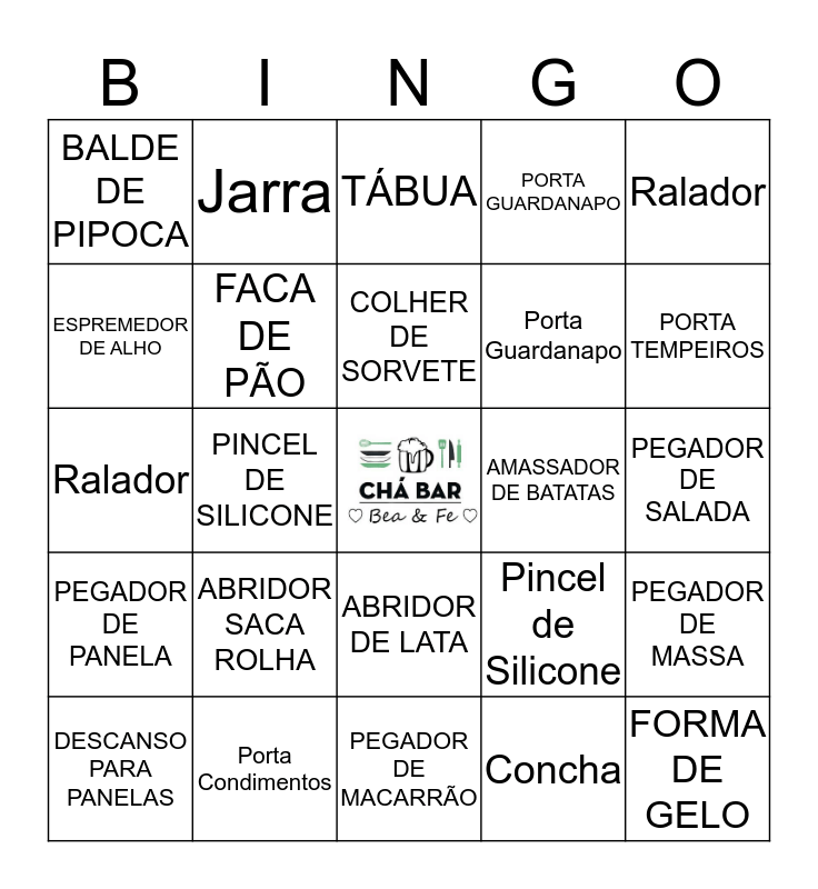This bingo card has a free space and 37 words: CABIDE, CONCHA, JARRA, FACA DE PÃO, PEGADOR DE MASSA, ABRIDOR SACA ROLHA, COLHER DE SORVETE, POTE PLÁSTICO, Ralador, Escorredor de arroz, PINCEL DE SILICONE, PORTA GUARDANAPO, FORMA DE GELO, PEGADOR DE SALADA, ESPREMEDOR DE ALHO, PEGADOR DE PANELA, MEDIDOR, TÁBUA, ABRIDOR DE LATA, AMASSADOR DE BATATAS, BALDE DE PIPOCA, PORTA TEMPEIROS, DESCANSO PARA PANELAS, PEGADOR DE MACARRÃO, Cabide, Concha, Jarra, Faca de Pão, Pegador de Massa, Abridor de Garrafa, Colher de Sorverte, Porta Condimentos, Ralador, Escorredor de Arroz, Pincel de Silicone, Porta Guardanapo and Forma de Gelo.