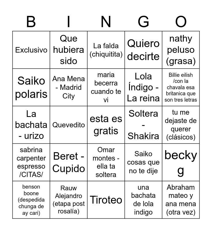 This bingo card has a free space and 24 words: Beret - Cupido, Rauw Alejandro (etapa post rosalía), maria becerra cuando te vi, benson boone (despedida chunga de ay cari), nathy peluso (grasa), Exclusivo, Saiko polaris, Que hubiera sido, Soltera - Shakira, Omar montes - ella ta soltera, Lola Índigo - La reina, La bachata - urizo, Saiko cosas que no te dije, becky g, Ana Mena - Madrid City, una bachata de lola indigo, tu me dejaste de querer (clásicos), La falda (chiquitita), Billie eilish /con la chavala esa britanica que son tres letras, Quevedito, Abraham mateo y ana mena (otra vez), sabrina carpenter espresso /CITAS/, Quiero decirte and Tiroteo.
