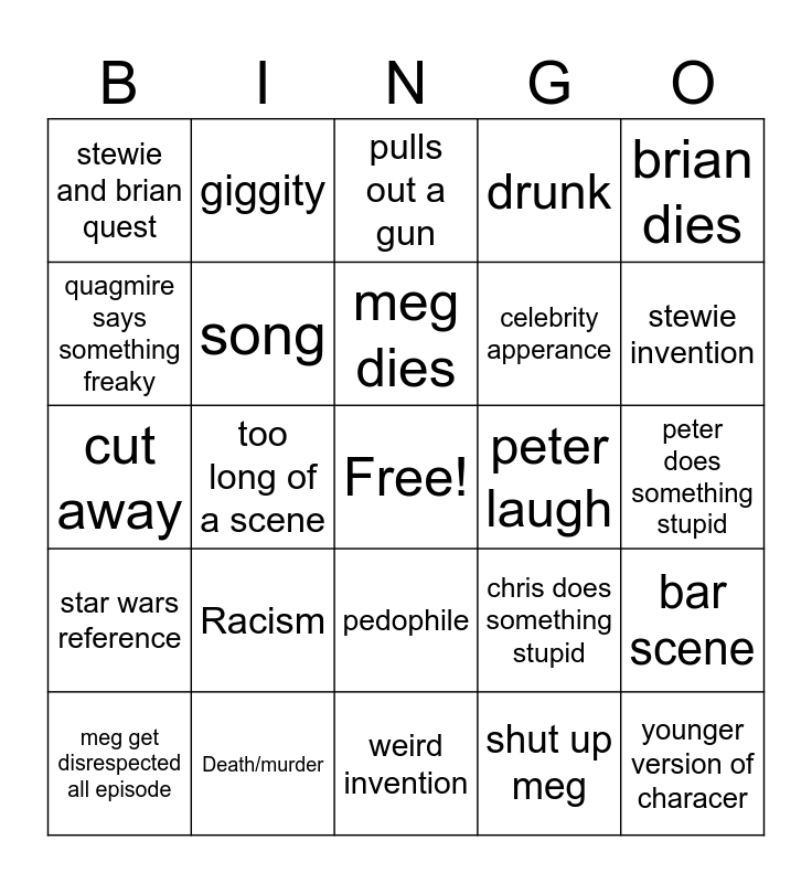 This bingo card has a free space and 24 words: Racism, Death/murder, meg dies, meg get disrespected all episode, brian dies, stewie and brian quest, quagmire says something freaky, giggity, peter laugh, pedophile, celebrity apperance, cut away, chris does something stupid, bar scene, song, shut up meg, peter does something stupid, pulls out a gun, stewie invention, too long of a scene, younger version of characer, star wars reference, drunk and weird invention.