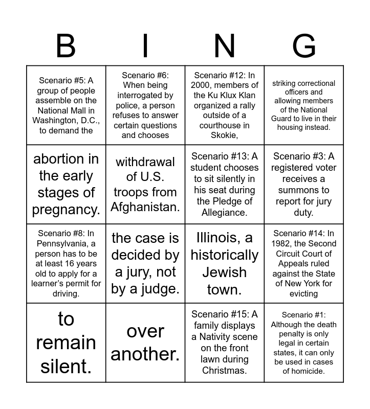 This bingo card has 23 words: Scenario #1: Although the death penalty is only legal in certain states, it can only be used in cases of homicide., Scenario #2: Before entering a suspect’s home, a police officer shows a search warrant., Scenario #3: A registered voter receives a summons to report for jury duty., Scenario #4: In 1973, the U.S. Supreme Court ruled in Roe v. Wade that a woman has the legal right to an, abortion in the early stages of pregnancy., Scenario #5: A group of people assemble on the National Mall in Washington, D.C., to demand the, withdrawal of U.S. troops from Afghanistan., Scenario #6: When being interrogated by police, a person refuses to answer certain questions and chooses, to remain silent., Scenario #7: When a passenger sues a city transportation authority because she sustained neck injuries,, the case is decided by a jury, not by a judge., Scenario #8: In Pennsylvania, a person has to be at least 16 years old to apply for a learner’s permit for driving., Scenario #9: A teenager goes duck hunting with her father in October., Scenario #10: During election season, a local newspaper publishes an editorial endorsing one candidate, over another., Scenario #11: A person accused of murder cannot afford to hire a lawyer and is assigned a public defender., Scenario #12: In 2000, members of the Ku Klux Klan organized a rally outside of a courthouse in Skokie,, Illinois, a historically Jewish town., Scenario #13: A student chooses to sit silently in his seat during the Pledge of Allegiance., Scenario #14: In 1982, the Second Circuit Court of Appeals ruled against the State of New York for evicting, striking correctional officers and allowing members of the National Guard to live in their housing instead., Scenario #15: A family displays a Nativity scene on the front lawn during Christmas. and Scenario #16: Americans must be at least 21 years of age to purchase alcohol legally..