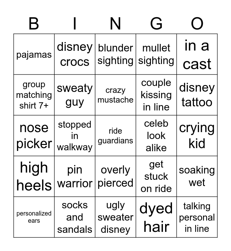 This bingo card has 25 words: pin warrior, ugly sweater disney, crazy mustache, personalized ears, in a cast, pajamas, group matching shirt 7+, disney crocs, celeb look alike, overly pierced, couple kissing in line, nose picker, get stuck on ride, soaking wet, sweaty guy, talking personal in line, crying kid, blunder sighting, disney tattoo, stopped in walkway, ride guardians, socks and sandals, high heels, mullet sighting and dyed hair.
