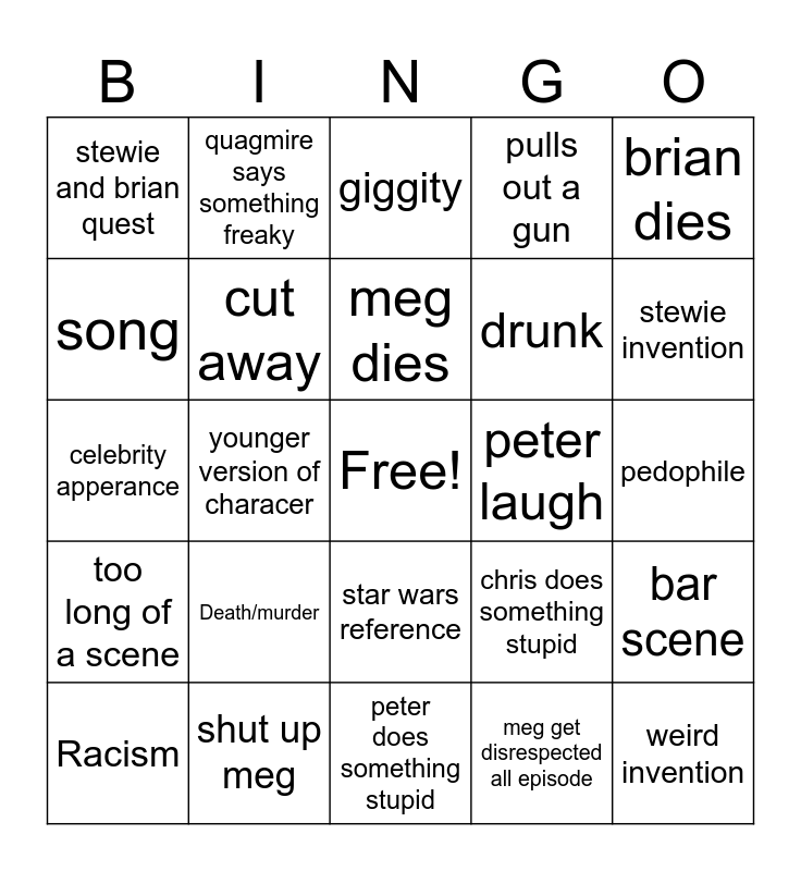 This bingo card has a free space and 24 words: Racism, Death/murder, meg dies, meg get disrespected all episode, brian dies, stewie and brian quest, quagmire says something freaky, giggity, peter laugh, pedophile, celebrity apperance, cut away, chris does something stupid, bar scene, song, shut up meg, peter does something stupid, pulls out a gun, stewie invention, too long of a scene, younger version of characer, star wars reference, drunk and weird invention.