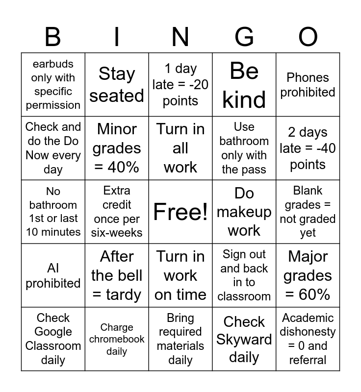 This bingo card has a free space and 24 words: After the bell = tardy, Charge chromebook daily, Turn in all work, Check Google Classroom daily, Phones prohibited, earbuds only with specific permission, Check and do the Do Now every day, Stay seated, Do makeup work, Turn in work on time, Use bathroom only with the pass, No bathroom 1st or last 10 minutes, Sign out and back in to classroom, Major grades = 60%, Minor grades = 40%, Check Skyward daily, Blank grades = not graded yet, 1 day late = -20 points, 2 days late = -40 points, Extra credit once per six-weeks, Academic dishonesty = 0 and referral, AI prohibited, Be kind and Bring required materials daily.