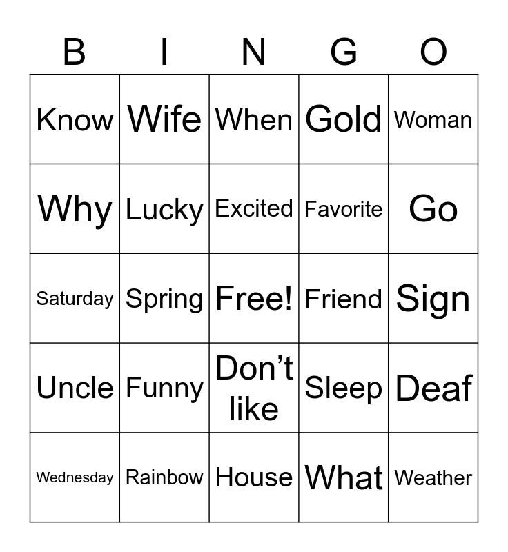 This bingo card has a free space and 28 words: Deaf, Please, Favorite, What, Why, When, Wife, Uncle, Friend, Wednesday, Saturday, Gold, Rainbow, House, Go, Class, Funny, Lucky, Excited, Don’t like, Know, Sick, Weather, Spring, Sign, Sleep, Woman and Man.