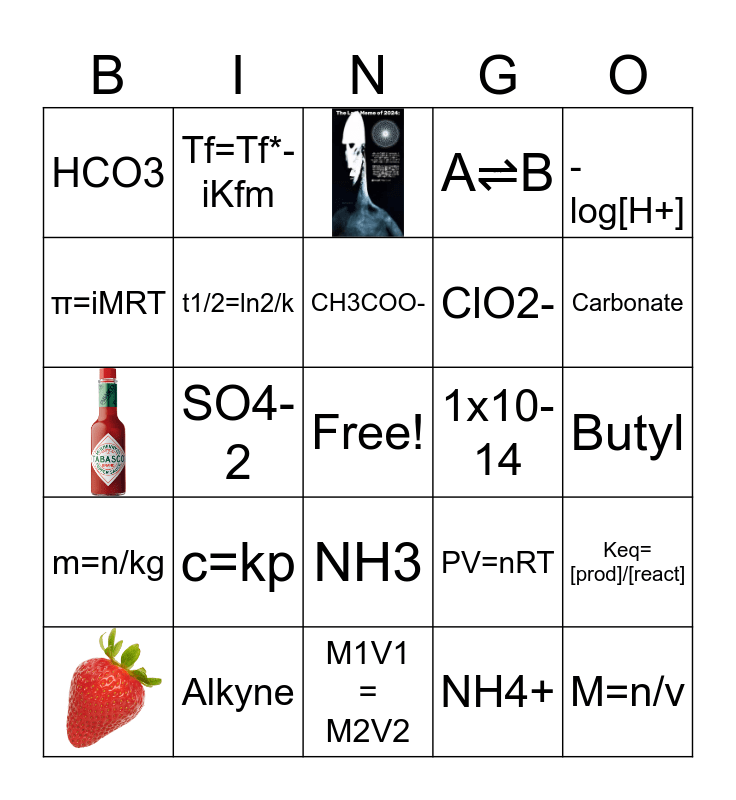 This bingo card has 12 images, a free space and 38 words: q=msΔt, M=n/v, D=g/ml, M1V1 = M2V2, c=kp, PA=XAPA*, Tf=Tf*-iKfm, Tb=Tb*+iKbm, π=iMRT, rate=k[A]*[B]*, t1/2=ln2/k, A⇌B, Keq=[prod]/[react], PV=nRT, HBr, CH3COOH, CH3COO-, 1x10-14, 14, -log[H+], SO4-2, NH4+, HCO3, ClO2-, 1x10-7, Carbonate, NH3, m=n/kg, Alkane, Alkene, Alkyne, Methyl, Ethyl, Propyl, Butyl, Cis, Trans and Saturated.