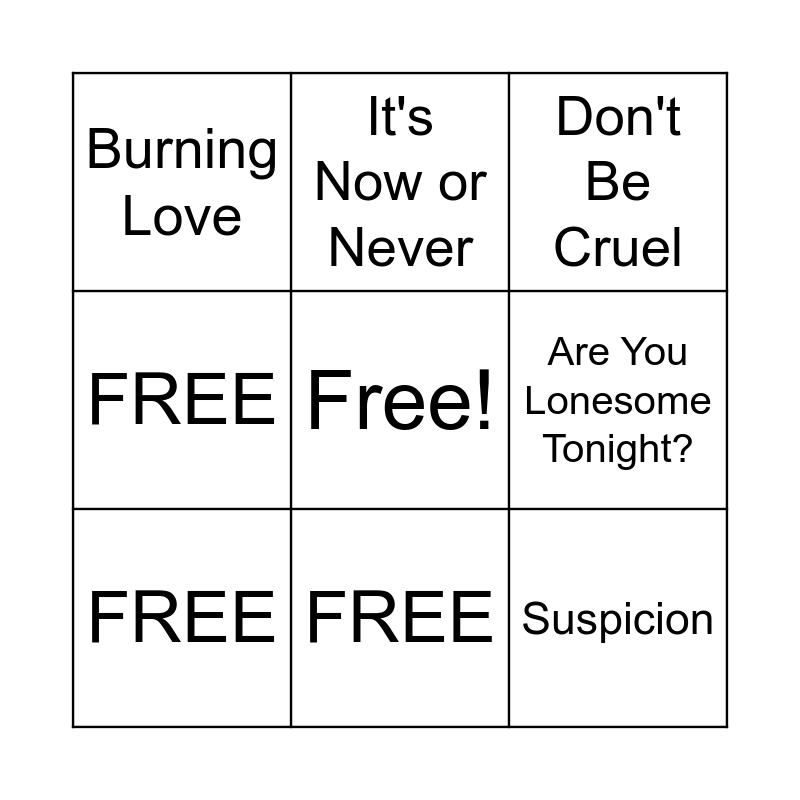 This bingo card has a free space and 16 words: Heartbreak Hotel, All Shook Up, Don't Be Cruel, Burning Love, Jailhouse Rock, It's Now or Never, Return to Sender, Blue Suede Shoes, Suspicion, Are You Lonesome Tonight?, HAPPY BIRTHDAY!, FREE, FREE, FREE, FREE and FREE.