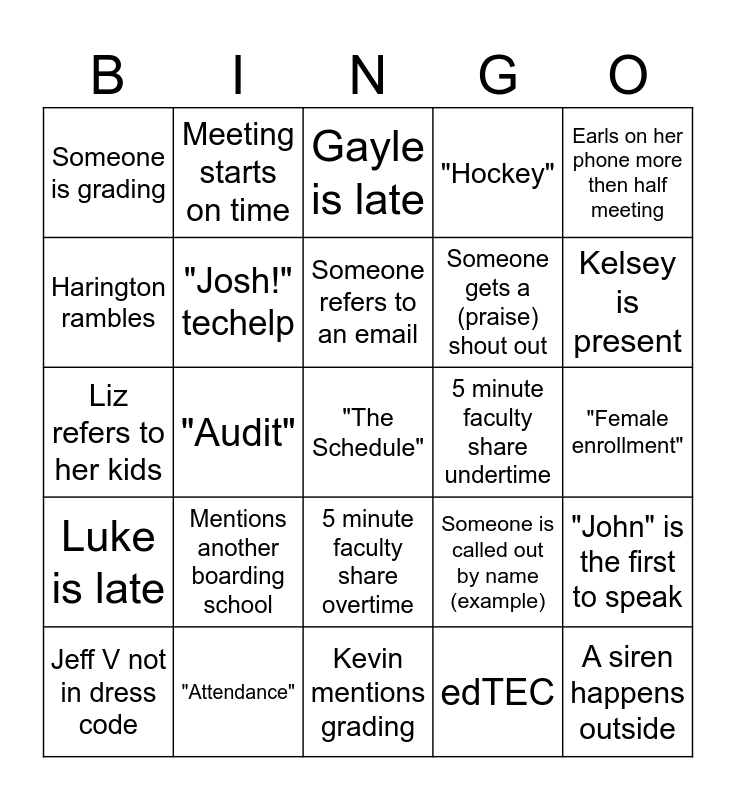 This bingo card has a free space and 37 words: Mentions Donors, Praises Admissions, Easler's Glasses Click in Mic, "Josh!" techelp, "John" is the first to speak, Mentions another boarding school, Someone refers to an email, Zoom in on the screen, Earls on her phone more then half meeting, Easler Absent, "Audit", "Hockey", A siren happens outside, "Female enrollment", Harington rambles, Luke is late, Durelle is late, Gayle is late, 5 minute faculty share overtime, 5 minute faculty share undertime, Someone is grading, Kelsey is present, Jeff V not in dress code, Kevin mentions grading, Comments mentioned, edTEC, Meeting starts on time, Meeting starts late, Canvas complaint, Someone closes the glass door, AOD phone rings, "Attendance", Liz refers to her kids, Meeting ends early, Someone is called out by name (example), Someone gets a (praise) shout out and Wally cuts off a back 'n' forth.