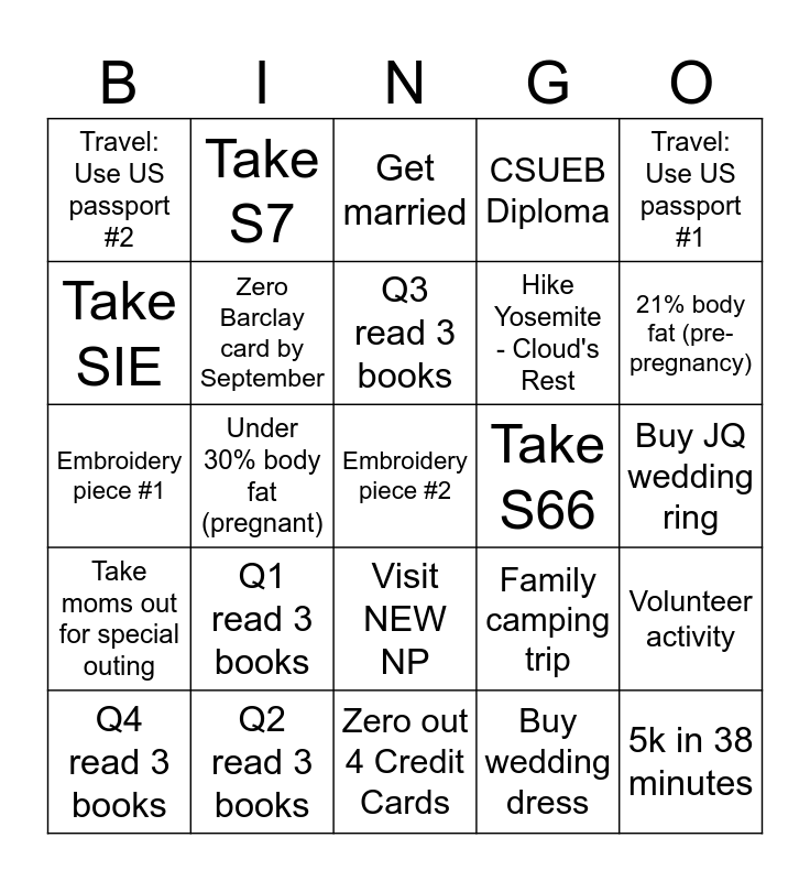 This bingo card has a free space and 24 words: Q1 read 3 books, Q2 read 3 books, Q3 read 3 books, Q4 read 3 books, Travel: Use US passport #1, Travel: Use US passport #2, Take SIE, Take S7, Take S66, Visit NEW NP, Hike Yosemite - Cloud's Rest, Embroidery piece #1, Family camping trip, Volunteer activity, Zero Barclay card by September, Buy wedding dress, Buy JQ wedding ring, Get married, 21% body fat (pre-pregnancy), Under 30% body fat (pregnant), 5k in 38 minutes, Take moms out for special outing, CSUEB Diploma and Zero out 4 Credit Cards.