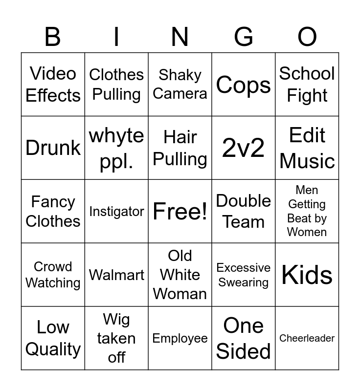 This bingo card has a free space and 24 words: Walmart, Wig taken off, Hair Pulling, Low Quality, School Fight, Video Effects, Drunk, Clothes Pulling, Double Team, Old White Woman, 2v2, Fancy Clothes, Excessive Swearing, Kids, whyte ppl., One Sided, Men Getting Beat by Women, Shaky Camera, Edit Music, Instigator, Cheerleader, Crowd Watching, Cops and Employee.