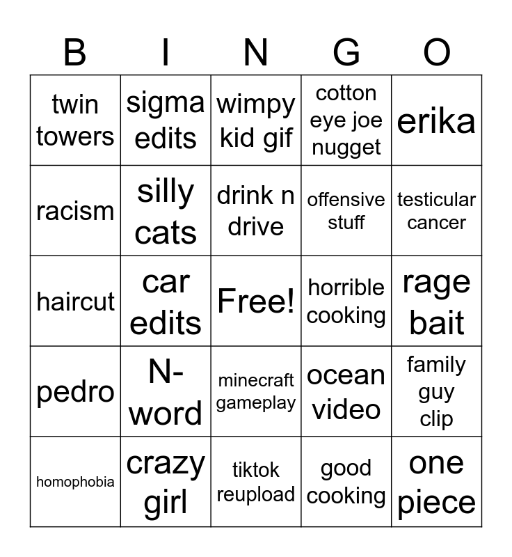 This bingo card has a free space and 24 words: N-word, crazy girl, drink n drive, homophobia, erika, twin towers, racism, sigma edits, horrible cooking, minecraft gameplay, offensive stuff, haircut, ocean video, family guy clip, silly cats, good cooking, rage bait, wimpy kid gif, testicular cancer, car edits, one piece, pedro, cotton eye joe nugget and tiktok reupload.