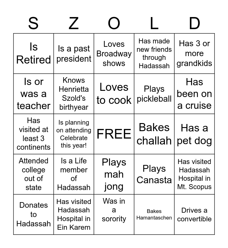 This bingo card has a free space and 24 words: Is a Life member of Hadassah, Has visited Hadassah Hospital in Ein Karem, Loves to cook, Donates to Hadassah, Has 3 or more grandkids, Is Retired, Is or was a teacher, Is a past president, Bakes challah, Plays mah jong, Plays pickleball, Has visited at least 3 continents, Plays Canasta, Has visited Hadassah Hospital in Mt. Scopus, Knows Henrietta Szold's birthyear, Bakes Hamantaschen, Has a pet dog, Loves Broadway shows, Has been on a cruise, Is planning on attending Celebrate this year!, Drives a convertible, Attended college out of state, Has made new friends through Hadassah and Was in a sorority.