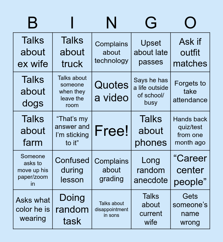 This bingo card has a free space and 24 words: Confused during lesson, Doing random task, Quotes a video, Asks what color he is wearing, Ask if outfit matches, Talks about ex wife, Talks about dogs, Talks about truck, Talks about phones, Complains about grading, Says he has a life outside of school/ busy, Talks about farm, Long random anecdote, “Career center people”, Talks about someone when they leave the room, Talks about current wife, Hands back quiz/test from one month ago, Complains about technology, Forgets to take attendance, “That’s my answer and I’m sticking to it”, Gets someone’s name wrong, Someone asks to move up his paper/zoom in, Upset about late passes and Talks about disappointment in sons.