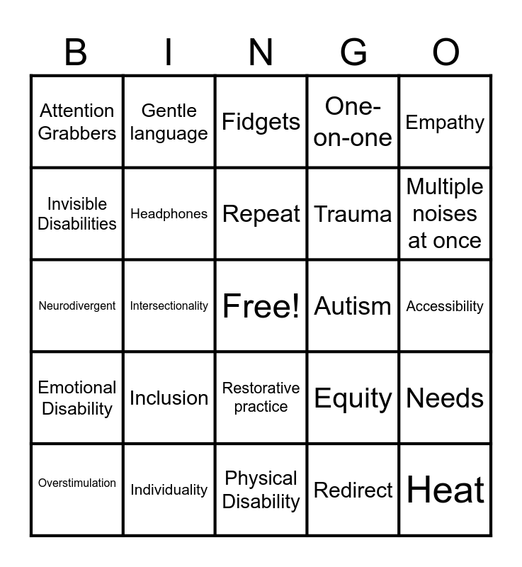 This bingo card has a free space and 29 words: Overstimulation, Vocal ticks, Intersectionality, ADHD, Attention Grabbers, Fidgets, Headphones, Inclusion, Autism, Individuality, Accessibility, Heat, Physical Disability, Redirect, Multiple noises at once, Safe Body, Restorative practice, Emotional Disability, Empathy, Neurodivergent, Equity, Auditory processing, Trauma, Invisible Disabilities, One-on-one, Gentle language, Needs, Repeat and Has vs. is.