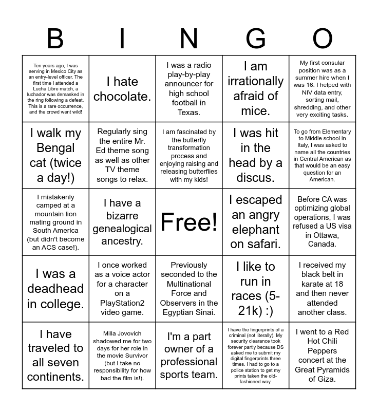 This bingo card has a free space and 29 words: I have traveled to all seven continents., I weighed less than 3 pounds when I was born, and my first car ride was in an ambulance., I have a bizarre genealogical ancestry., I was a talent judge on the most popular daytime show in the Philippines., Ten years ago, I was serving in Mexico City as an entry-level officer. The first time I attended a Lucha Libre match, a luchador was demasked in the ring following a defeat. This is a rare occurrence, and the crowd went wild!, I was a radio play-by-play announcer for high school football in Texas., Regularly sing the entire Mr. Ed theme song as well as other TV theme songs to relax., I once worked as a voice actor for a character on a PlayStation2 video game., I escaped an angry elephant on safari., Milla Jovovich shadowed me for two days for her role in the movie Survivor (but I take no responsibility for how bad the film is!)., Before CA was optimizing global operations, I was refused a US visa in Ottawa, Canada., I went to a Red Hot Chili Peppers concert at the Great Pyramids of Giza., I'm a part owner of a professional sports team., I have the fingerprints of a criminal (not literally). My security clearance took forever partly because DS asked me to submit my digital fingerprints three times. I had to go to a police station to get my prints taken the old-fashioned way., To go from Elementary to Middle school in Italy, I was asked to name all the countries in Central American as that would be an easy question for an American., I marched in the Macy's Thanksgiving Day parade as a drum major for my high school band., Previously seconded to the Multinational Force and Observers in the Egyptian Sinai., I was a deadhead in college., My first consular position was as a summer hire when I was 16. I helped with NIV data entry, sorting mail, shredding, and other very exciting tasks., I mistakenly camped at a mountain lion mating ground in South America (but didn't become an ACS case!)., I like to run in races (5-21k) :), I sang at Carnegie Hall and Lincoln Center., I was hit in the head by a discus., I walk my Bengal cat (twice a day!), I am irrationally afraid of mice., I hate chocolate., I received my black belt in karate at 18 and then never attended another class., I am fascinated by the butterfly transformation process and enjoying raising and releasing butterflies with my kids! and I sometimes have sleep paralysis, meaning I wake up in the middle of the night and can't move. Back in the day, people thought it meant they were possessed. Good times..