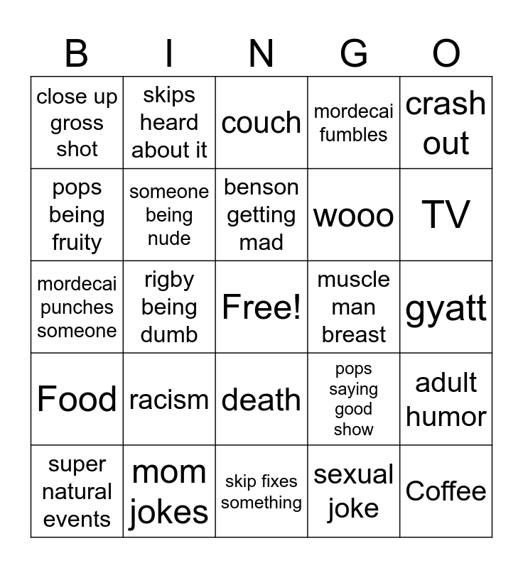 This bingo card has a free space and 24 words: racism, mom jokes, benson getting mad, super natural events, crash out, close up gross shot, pops being fruity, skips heard about it, muscle man breast, death, wooo, mordecai punches someone, pops saying good show, adult humor, someone being nude, sexual joke, gyatt, couch, TV, rigby being dumb, Coffee, Food, mordecai fumbles and skip fixes something.