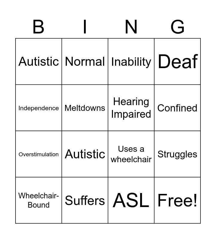 This bingo card has 23 words: Free!, Plain Language Explanations, Confined, Blind, Independence, Autistic, Meltdowns, Normal, Wheelchair-Bound, Asbergers, Autistic, Overstimulation, Limited, Depends, Suffers, Poor Mobility, Inability, Uses a wheelchair, Hearing Impaired, Struggles, Deaf, ASL and Mental Age.