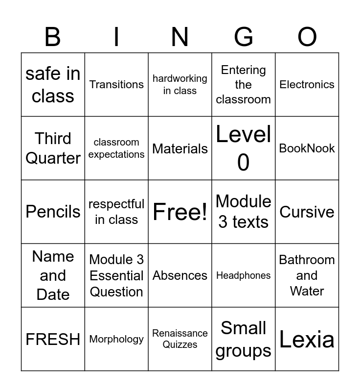 This bingo card has a free space and 29 words: FRESH, friendly in class, respectful in class, empathetic in class, safe in class, hardworking in class, classroom expectations, Module 3 Essential Question, Module 3 texts, Morphology, Cursive, Lexia, Renaissance Quizzes, Small groups, BookNook, Methods of Assessment, Absences, Name and Date, Electronics, Pencils, Headphones, Kleenex, Level 0, Third Quarter, Entering the classroom, Transitions, Bathroom and Water, Materials and Cafeteria and Recess.