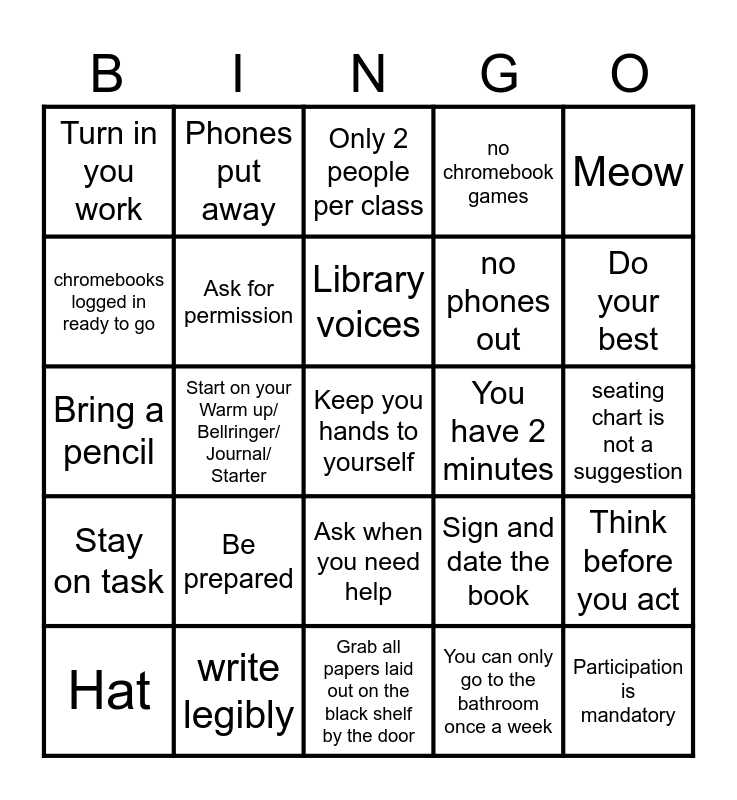 This bingo card has 31 words: Grab all papers laid out on the black shelf by the door, Collect all supplies needed for the class, Start on your Warm up/ Bellringer/ Journal/ Starter, Clean up your area, Turn in you work, Only 2 people per class, Ask for permission, Sign and date the book, You have 2 minutes, You can only go to the bathroom once a week, seating chart is not a suggestion, Keep you hands to yourself, Participation is mandatory, Follow directions, Do your best, Be kind to others and yourself, Think before you act, Be prepared, Stay on task, Ask when you need help, Meow, Moo, Hat, Phones put away, no phones out, chromebooks logged in ready to go, no chromebook games, Bring a pencil, write legibly, Library voices and Quack.