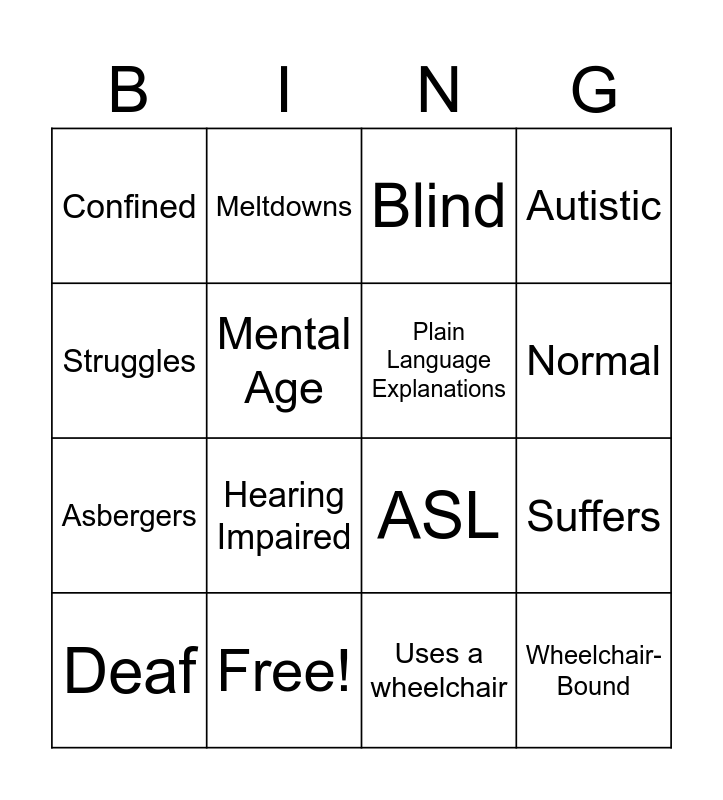 This bingo card has 22 words: Free!, Independence, Meltdowns, Poor Mobility, Mental Age, Plain Language Explanations, Confined, Blind, ASL, Wheelchair-Bound, Asbergers, Autistic, Overstimulation, Inability, Uses a wheelchair, Depends, Suffers, Deaf, Hearing Impaired, Struggles, Normal and Limited.