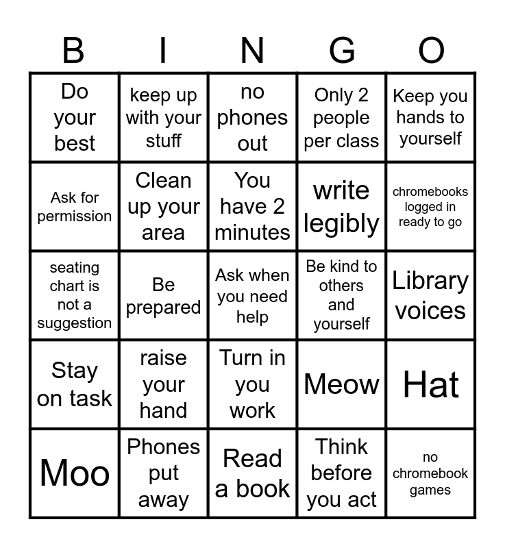 This bingo card has 35 words: Grab all papers laid out on the black shelf by the door, Collect all supplies needed for the class, Start on your Warm up/ Bellringer/ Journal/ Starter, Clean up your area, Turn in you work, Only 2 people per class, Ask for permission, Sign and date the book, You have 2 minutes, You can only go to the bathroom once a week, seating chart is not a suggestion, Keep you hands to yourself, Participation is mandatory, Follow directions, Do your best, Be kind to others and yourself, Think before you act, Be prepared, Stay on task, Ask when you need help, Meow, Moo, Hat, Phones put away, no phones out, chromebooks logged in ready to go, no chromebook games, Bring a pencil, write legibly, Library voices, Quack, Read a book, raise your hand, keep up with your stuff and be kind.