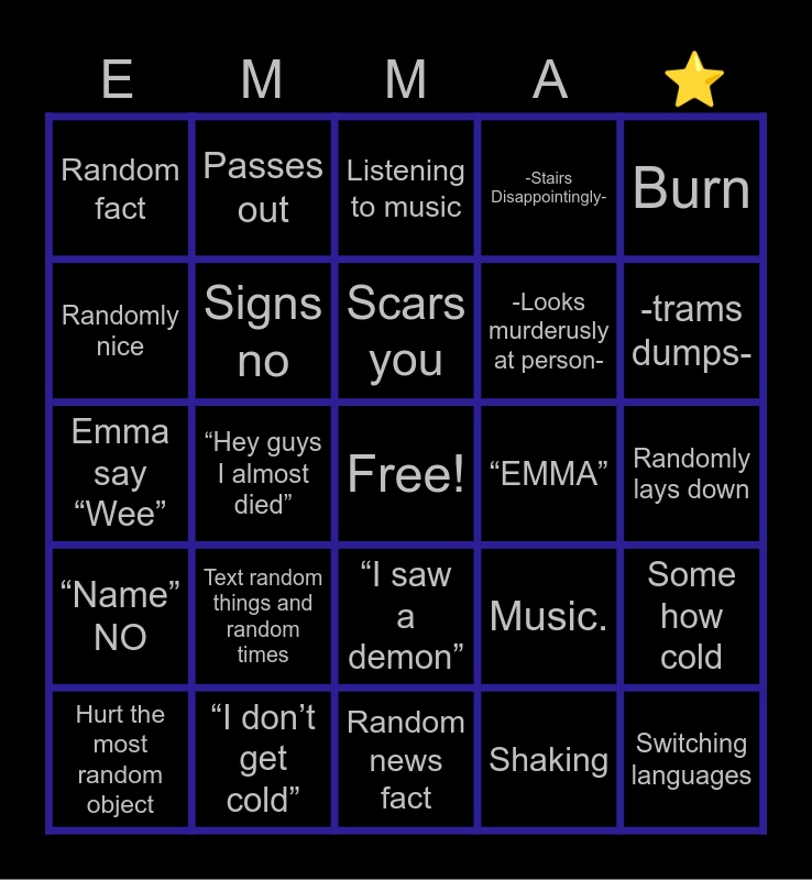 This bingo card has a free space and 32 words: Shaking, Random bandaid, “Hey guys I almost died”, Almost Car accident, “Name” NO, Signs no, Burn, Some how cold, Passes out, Didn’t eat, Scars you, Listening to music, Free space, Anything to do with harason, “EMMA”, Unexplained injury, Hurt the most random object, Emma say “Wee”, “I saw a demon”, Text random things and random times, Music., Sound effects, Randomly lays down, “I don’t get cold”, Switching languages, -Stairs Disappointingly-, -Looks murderusly at person-, Randomly nice, Random fact, Random news fact, Random weather fact and -trams dumps-.