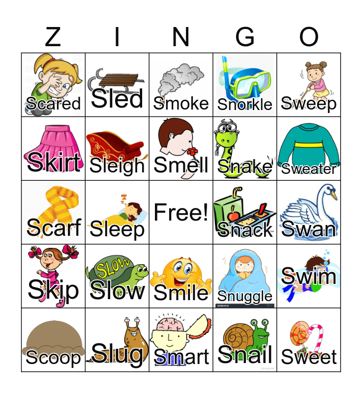 This bingo card has 24 images, a free space and 24 words: Scoop, Slow, Smell, Snail, Sweep, Scared, Sled, Smoke, Snack, Swan, Scarf, Sleigh, Snuggle, Swim, Skirt, Slug, Smart, Snorkle, Sweater, Skip, Sleep, Smile, Snake and Sweet.