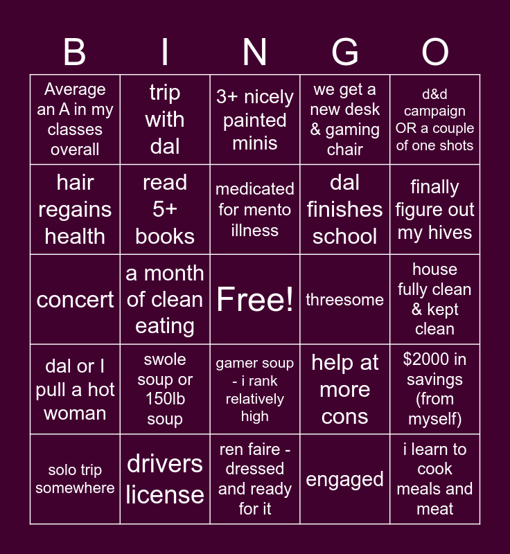 This bingo card has a free space and 24 words: swole soup or 150lb soup, drivers license, medicated for mento illness, solo trip somewhere, d&d campaign OR a couple of one shots, Average an A in my classes overall, hair regains health, trip with dal, threesome, gamer soup - i rank relatively high, dal finishes school, concert, help at more cons, $2000 in savings (from myself), read 5+ books, engaged, house fully clean & kept clean, 3+ nicely painted minis, finally figure out my hives, a month of clean eating, i learn to cook meals and meat, dal or I pull a hot woman, we get a new desk & gaming chair and ren faire - dressed and ready for it.