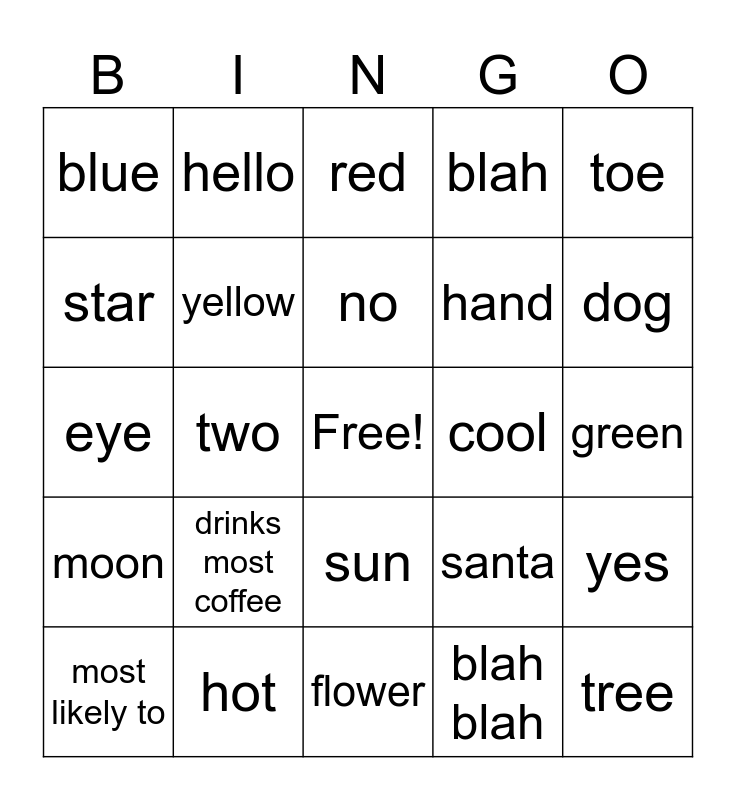 This bingo card has a free space and 29 words: most likely to, one, two, three, blue, red, yellow, drinks most coffee, cool, hot, green, tree, flower, blah blah, dog, cat, sun, moon, toe, eye, santa, foot, hand, star, blah, hello, yes, no and blue.