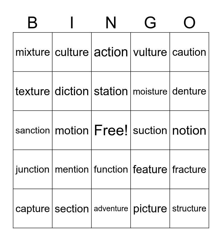 This bingo card has a free space and 29 words: capture, invention, motion, nurture, mixture, action, diction, mention, suction, section, notion, structure, adventure, picture, denture, portion, function, junction, caution, sanction, feature, nature, moisture, texture, vulture, culture, fracture, station and portion.