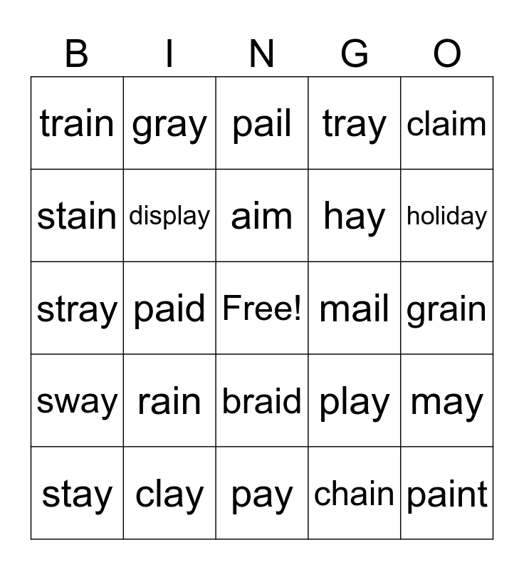 This bingo card has a free space and 24 words: rain, clay, aim, stay, claim, train, stain, gray, mail, braid, hay, stray, play, may, display, chain, grain, pail, holiday, paid, paint, sway, tray and pay.