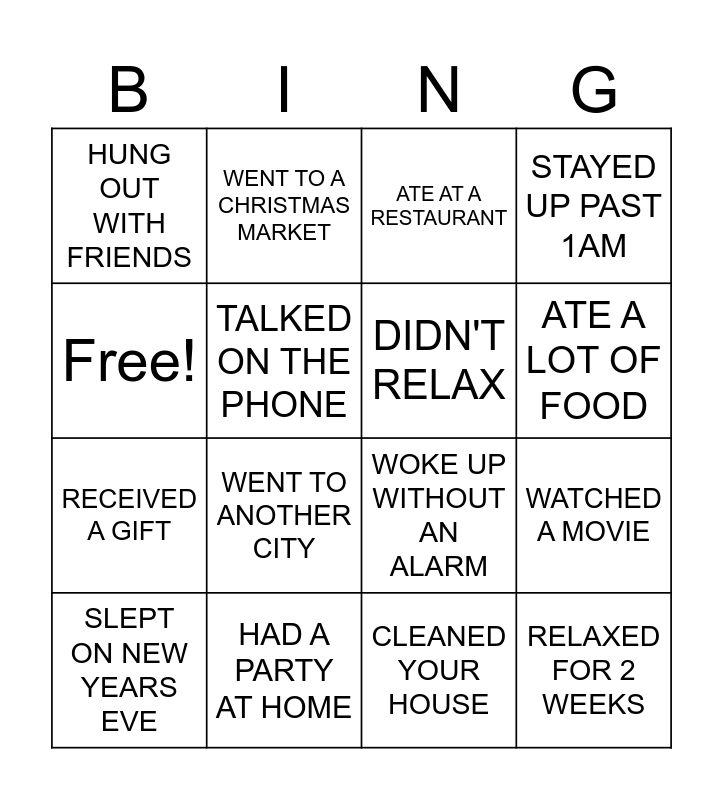 This bingo card has 16 words: HAD A PARTY AT HOME, WATCHED A MOVIE, ATE AT A RESTAURANT, HUNG OUT WITH FRIENDS, RECEIVED A GIFT, WENT TO A CHRISTMAS MARKET, WOKE UP WITHOUT AN ALARM, CLEANED YOUR HOUSE, Free!, TALKED ON THE PHONE, SLEPT ON NEW YEARS EVE, STAYED UP PAST 1AM, WENT TO ANOTHER CITY, ATE A LOT OF FOOD, DIDN'T RELAX and RELAXED FOR 2 WEEKS.