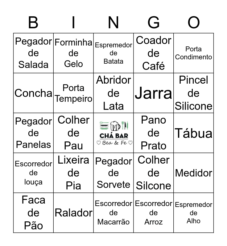 This bingo card has a free space and 24 words: Lixeira de Pia, Ralador, Abridor de Lata, Faca de Pão, Porta Condimento, Pegador de Salada, Concha, Forminha de Gelo, Pano de Prato, Pegador de Sorvete, Jarra, Pegador de Panelas, Colher de Silcone, Medidor, Porta Tempeiro, Escorredor de Arroz, Tábua, Espremedor de Batata, Pincel de Silicone, Colher de Pau, Espremedor de Alho, Escorredor de louça, Coador de Café and Escorredor de Macarrão.