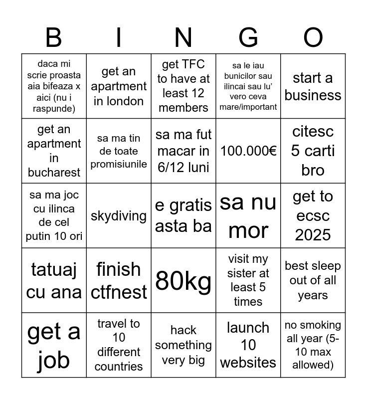 This bingo card has a free space and 24 words: finish ctfnest, travel to 10 different countries, sa ma fut macar in 6/12 luni, get a job, start a business, daca mi scrie proasta aia bifeaza x aici (nu i raspunde), get an apartment in bucharest, get an apartment in london, sa nu mor, 80kg, 100.000€, sa ma joc cu ilinca de cel putin 10 ori, visit my sister at least 5 times, best sleep out of all years, sa ma tin de toate promisiunile, launch 10 websites, get to ecsc 2025, get TFC to have at least 12 members, citesc 5 carti bro, skydiving, no smoking all year (5-10 max allowed), tatuaj cu ana, sa le iau bunicilor sau ilincai sau lu’ vero ceva mare/important and hack something very big.