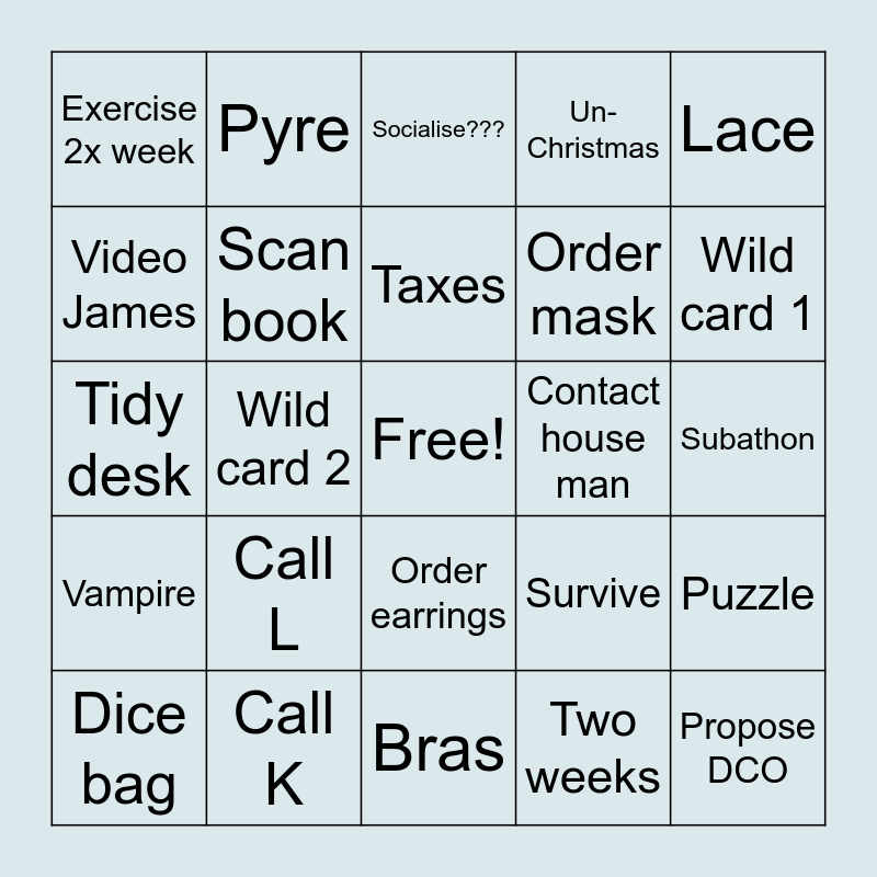 This bingo card has a free space and 24 words: Call L, Call K, Taxes, Dice bag, Lace, Exercise 2x week, Video James, Pyre, Contact house man, Order earrings, Order mask, Tidy desk, Survive, Puzzle, Scan book, Two weeks, Subathon, Socialise???, Wild card 1, Wild card 2, Propose DCO, Vampire, Un-Christmas and Bras.