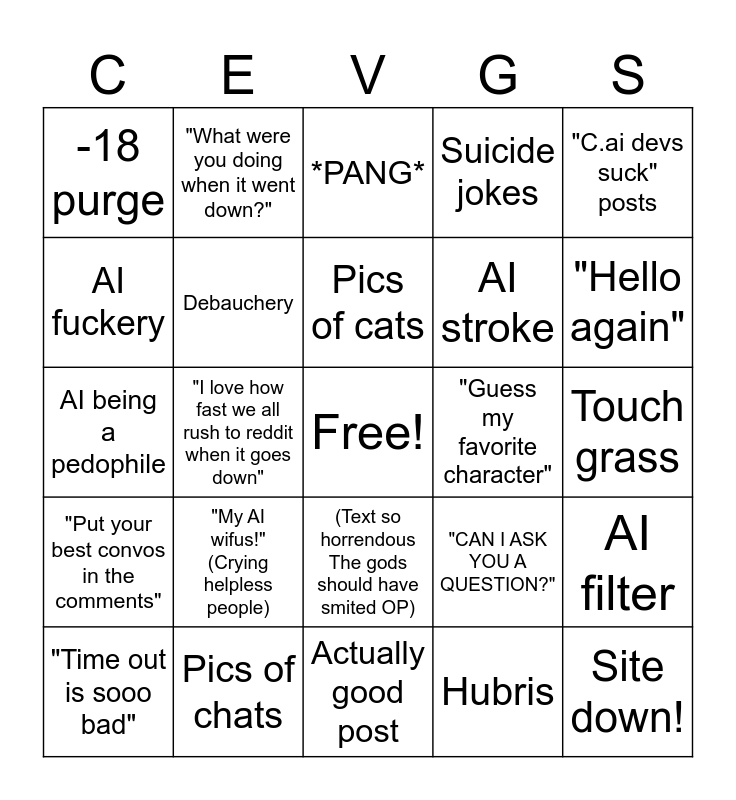 This bingo card has a free space and 24 words: "My AI wifus!" (Crying helpless people), Pics of chats, Pics of cats, "Time out is sooo bad", "C.ai devs suck" posts, -18 purge, AI fuckery, "What were you doing when it went down?", "Guess my favorite character", (Text so horrendous The gods should have smited OP), AI stroke, AI being a pedophile, "CAN I ASK YOU A QUESTION?", AI filter, Debauchery, Hubris, Touch grass, *PANG*, "Hello again", "I love how fast we all rush to reddit when it goes down", Site down!, "Put your best convos in the comments", Suicide jokes and Actually good post.