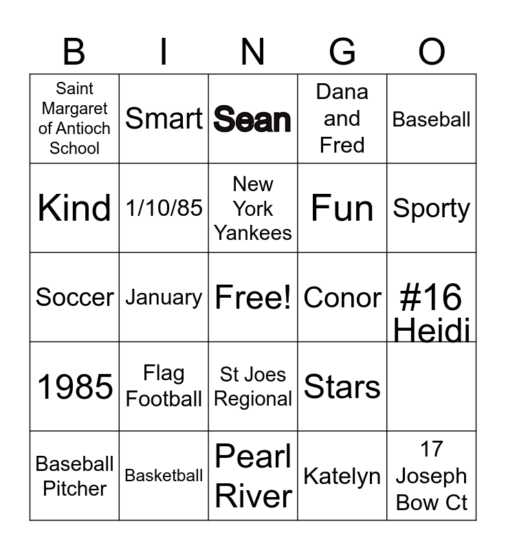 This bingo card has a free space and 33 words: Sara, Spicer, January, 10th, 1985, 1/10/85, Baseball, Baseball Pitcher, Smart, Mathematician, New York Yankees, Sean, Shannon, Daniel, Conor, Sporty, Basketball, Soccer, Flag Football, Stars, St Joes Regional, Rutgers University, Saint Margaret of Antioch School, #16, Pearl River, 17 Joseph Bow Ct, Dana and Fred, Fun, Kind, Heidi, Ryan, Katelyn and Athletic.