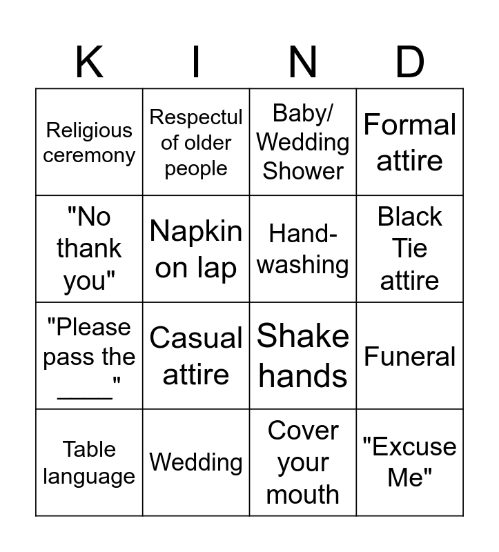This bingo card has 16 words: Wedding, Funeral, Baby/ Wedding Shower, Religious ceremony, "Please pass the ____", Respectul of older people, Shake hands, Cover your mouth, "No thank you", Napkin on lap, Table language, Formal attire, Casual attire, Black Tie attire, Hand- washing and "Excuse Me".