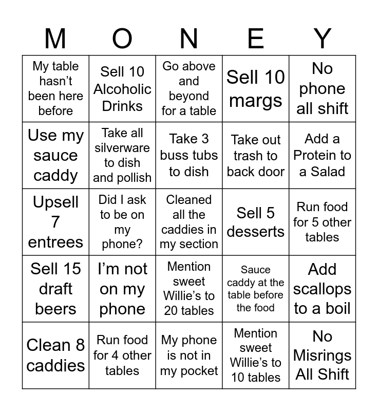 This bingo card has a free space and 24 words: I’m not on my phone, Run food for 4 other tables, Take 3 buss tubs to dish, Clean 8 caddies, No phone all shift, My table hasn’t been here before, Use my sauce caddy, Sell 10 Alcoholic Drinks, Sell 5 desserts, Mention sweet Willie’s to 20 tables, Take out trash to back door, Upsell 7 entrees, Sauce caddy at the table before the food, Add scallops to a boil, Take all silverware to dish and pollish, Mention sweet Willie’s to 10 tables, Run food for 5 other tables, Go above and beyond for a table, Add a Protein to a Salad, Did I ask to be on my phone?, No Misrings All Shift, Sell 15 draft beers, Sell 10 margs and My phone is not in my pocket.
