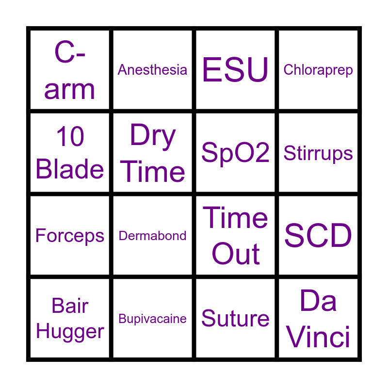 This bingo card has 16 words: Bupivacaine, SCD, ESU, C-arm, Forceps, Anesthesia, Time Out, Suture, 10 Blade, Dry Time, Bair Hugger, Chloraprep, Dermabond, Stirrups, SpO2 and Da Vinci.