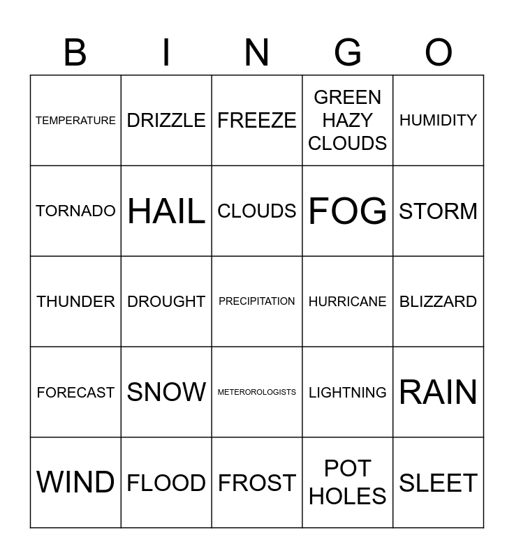 This bingo card has 25 words: SNOW, FROST, CLOUDS, WIND, HUMIDITY, TEMPERATURE, TORNADO, DRIZZLE, HURRICANE, METEROROLOGISTS, FOG, THUNDER, LIGHTNING, RAIN, HAIL, SLEET, BLIZZARD, FREEZE, STORM, DROUGHT, PRECIPITATION, FLOOD, FORECAST, GREEN HAZY CLOUDS and POT HOLES.
