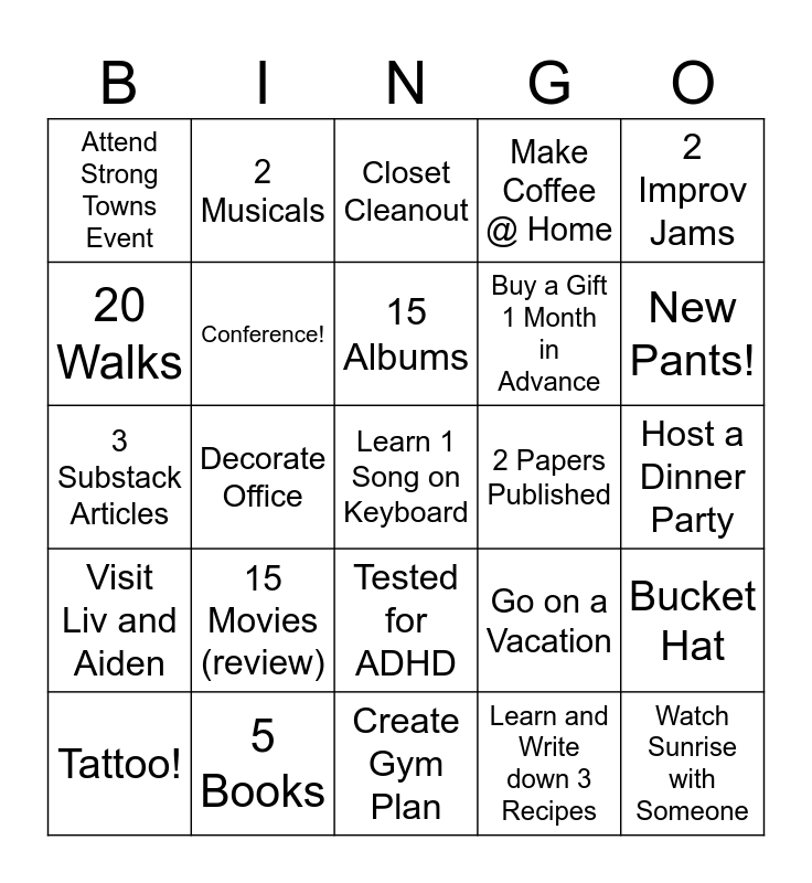 This bingo card has a free space and 24 words: 15 Movies (review), 5 Books, 15 Albums, Tattoo!, 2 Improv Jams, Attend Strong Towns Event, 20 Walks, 2 Musicals, 2 Papers Published, Tested for ADHD, Buy a Gift 1 Month in Advance, 3 Substack Articles, Go on a Vacation, Bucket Hat, Conference!, Learn and Write down 3 Recipes, Host a Dinner Party, Closet Cleanout, New Pants!, Decorate Office, Watch Sunrise with Someone, Visit Liv and Aiden, Make Coffee @ Home and Create Gym Plan.