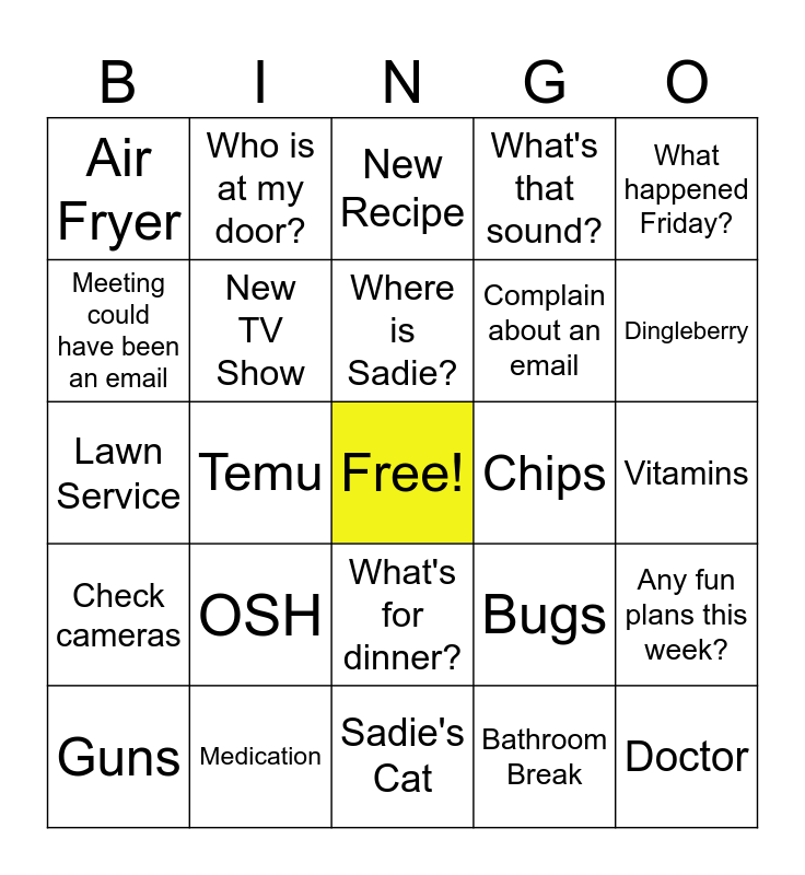 This bingo card has a free space and 29 words: Guns, Knives, Temu, Cottage Cheese, Air Fryer, New Recipe, New TV Show, OSH, Chips, Medication, Vitamins, Doctor, Sadie's Cat, Bathroom Break, Dingleberry, Braves, What's for dinner?, Check cameras, What happened Friday?, Lawn Service, Bugs, Screen share, Complain about an email, Meeting could have been an email, What's that sound?, Who is at my door?, Any fun plans this week?, Where is Sadie? and Upgrades.