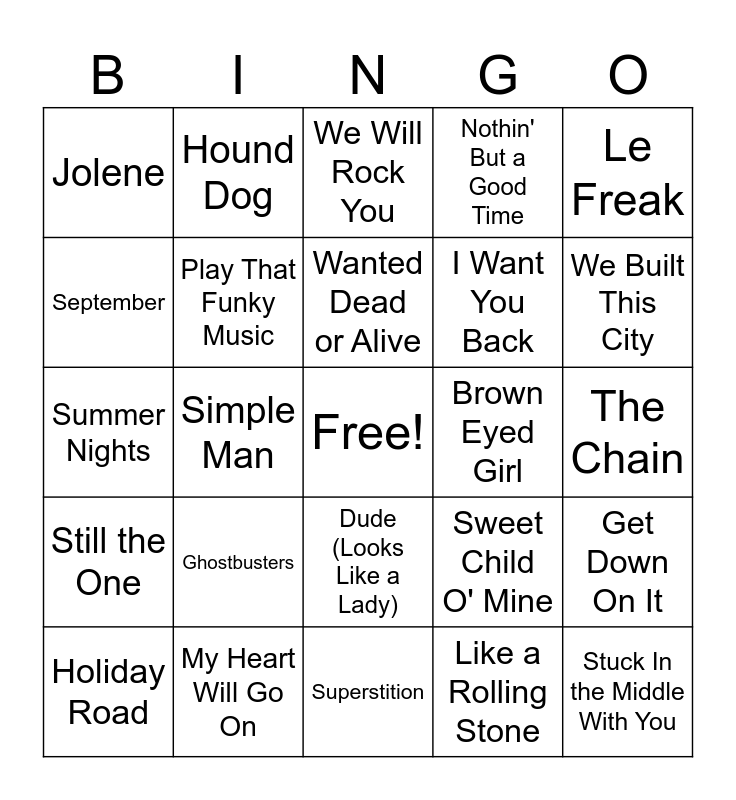 This bingo card has a free space and 26 words: Dude (Looks Like a Lady), Like a Rolling Stone, Wanted Dead or Alive, My Heart Will Go On, Le Freak, Jolene, September, Hound Dog, The Chain, Sweet Child O' Mine, I Want You Back, Summer Nights, Get Down On It, Holiday Road, Simple Man, If You Leave, Nothin' But a Good Time, Still the One, We Will Rock You, Stuck In the Middle With You, We Built This City, Superstition, Brown Eyed Girl, Ghostbusters, Play That Funky Music and Sharp Dressed Man.