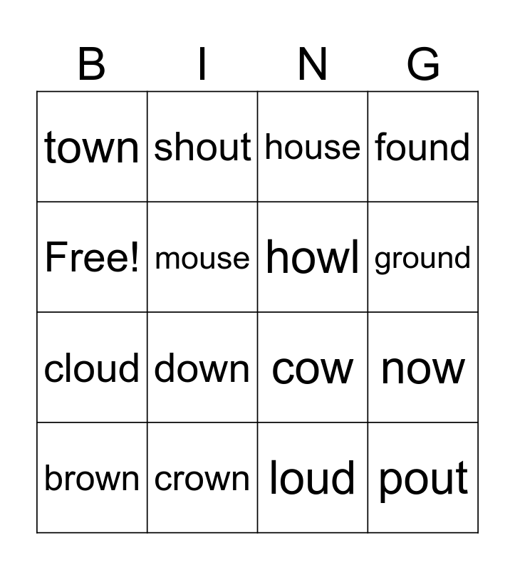 This bingo card has 16 words: crown, now, house, town, cloud, shout, cow, loud, Free!, mouse, brown, found, down, ground, howl and pout.