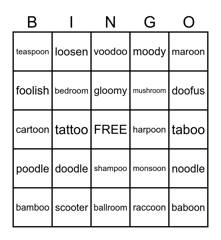 This bingo card has a free space and 24 words: doodle, scooter, gloomy, bamboo, maroon, teaspoon, foolish, loosen, harpoon, shampoo, mushroom, cartoon, monsoon, noodle, bedroom, raccoon, taboo, voodoo, doofus, tattoo, baboon, poodle, moody and ballroom.