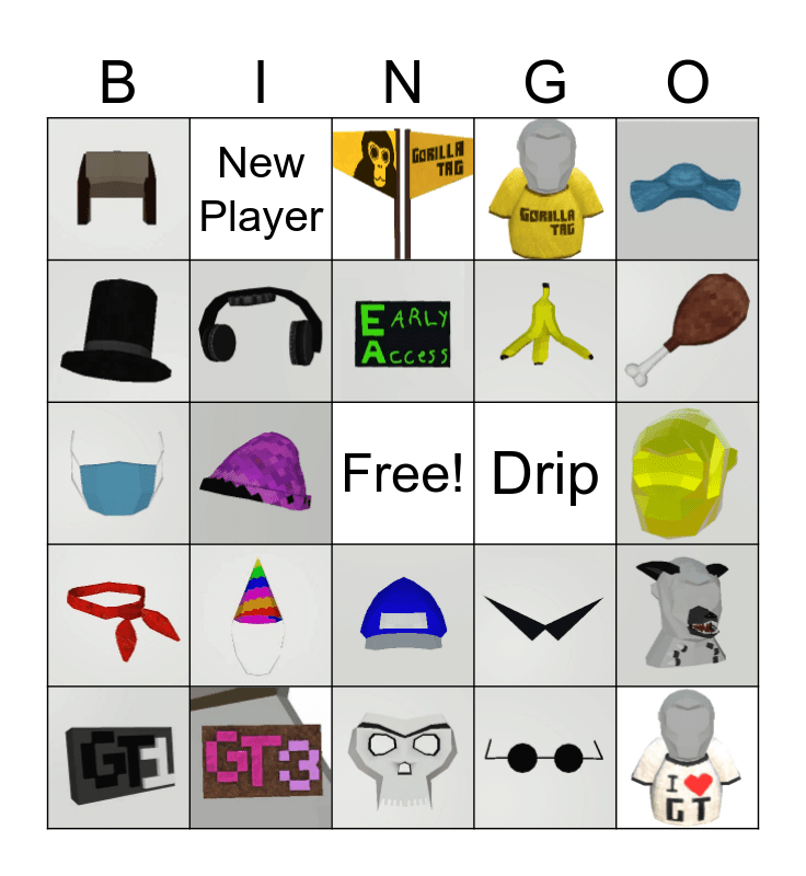 This bingo card has 22 images, a free space and 2 words: New Player and Drip.