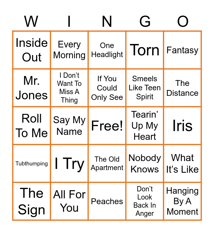 This bingo card has a free space and 100 words: Push, Slide, Iris, Semi-Charmed Life, Never Let You Go, Creep, Spoonman, No Scrubs, Quit Playing Games With My Heart, Show Me The Meaning Of Being Lonely, Just To See You Smile, Welcome To Paradise, When I Come Around, All For You, Girl On TV, Summer Girls, Smeels Like Teen Spirit, Heart-Shaped Box, Shoop, Whatta Man, All My Life, No Diggity, Macarena, Water Runs Dry, Motownphilly, Tearin’ Up My Heart, Fantasy, Nobody Knows, Angel Of Mine, You Make Me Wanna…, Say My Name, Inside Out, Everlong, Fade Into You, Don’t Look Back In Anger, If You Could Only See, What It’s Like, Lightning Crashes, Two Princes, Hey Jealousy, Save Tonight, Drive, Roll To Me, Flagpole Sitta, The Distance, One Headlight, Low, Song 2, Loser, Peaches, Any Man Of Mine, Be My Baby Tonight, Neon Moon, Chattahoochee, Strawberry Wine, What A Girl Wants, Doo Wop (That Thing), …Baby One More Time, Miami, Torn, Mambo No. 5 (a Little Bit of…), Wannabe, It’s All Coming Back To Me Now, Butterfly, Zombie, Gangsta’s Paradise, Smooth, If You Had My Love, Livin’ La Vida Loca, There’s Your Trouble, Under The Bridge, I Try, Truly Madly Deeply, Losing My Religion, Kiss Me, All Star, Santeria, Mr. Jones, Meet Virginia, Building A Mystery, Everything You Want, Hanging By A Moment, One Week, The Old Apartment, This Is How We Do It, Every Morning, Man! I Feel Like A Woman, MMMBop, Closing Time, Tubthumping, Only Wanna Be With You, If It Makes You Happy, What’s Up?, The Sign, I Don’t Want To Miss A Thing, I Swear, Run-Around, Praise You, U Can’t Touch This and Return Of The Mack.
