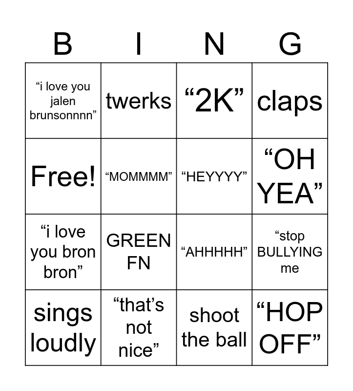 This bingo card has 16 words: “that’s not nice”, “stop BULLYING me, “2K”, “i love you jalen brunsonnnn”, “i love you bron bron”, twerks, “AHHHHH”, shoot the ball, Free!, “MOMMMM”, sings loudly, claps, GREEN FN, “OH YEA”, “HEYYYY” and “HOP OFF”.