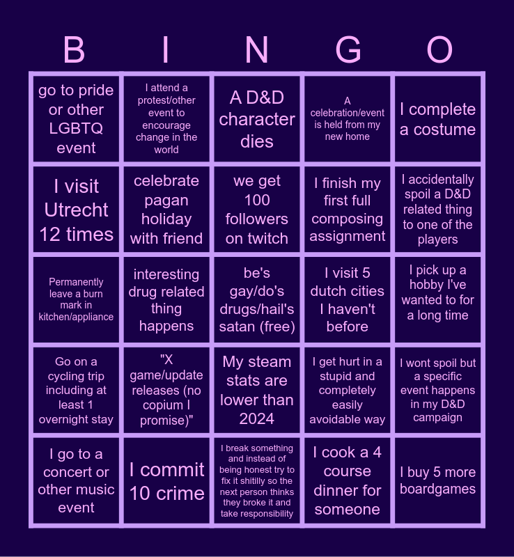 This bingo card has a free space and 24 words: "X game/update releases (no copium I promise)", I commit 10 crime, we get 100 followers on twitch, I go to a concert or other music event, I complete a costume, go to pride or other LGBTQ event, I visit Utrecht 12 times, I attend a protest/other event to encourage change in the world, I visit 5 dutch cities I haven't before, My steam stats are lower than 2024, I finish my first full composing assignment, Permanently leave a burn mark in kitchen/appliance, I get hurt in a stupid and completely easily avoidable way, I wont spoil but a specific event happens in my D&D campaign, celebrate pagan holiday with friend, I cook a 4 course dinner for someone, I pick up a hobby I've wanted to for a long time, A D&D character dies, I accidentally spoil a D&D related thing to one of the players, interesting drug related thing happens, I buy 5 more boardgames, Go on a cycling trip including at least 1 overnight stay, A celebration/event is held from my new home and I break something and instead of being honest try to fix it shitilly so the next person thinks they broke it and take responsibility.